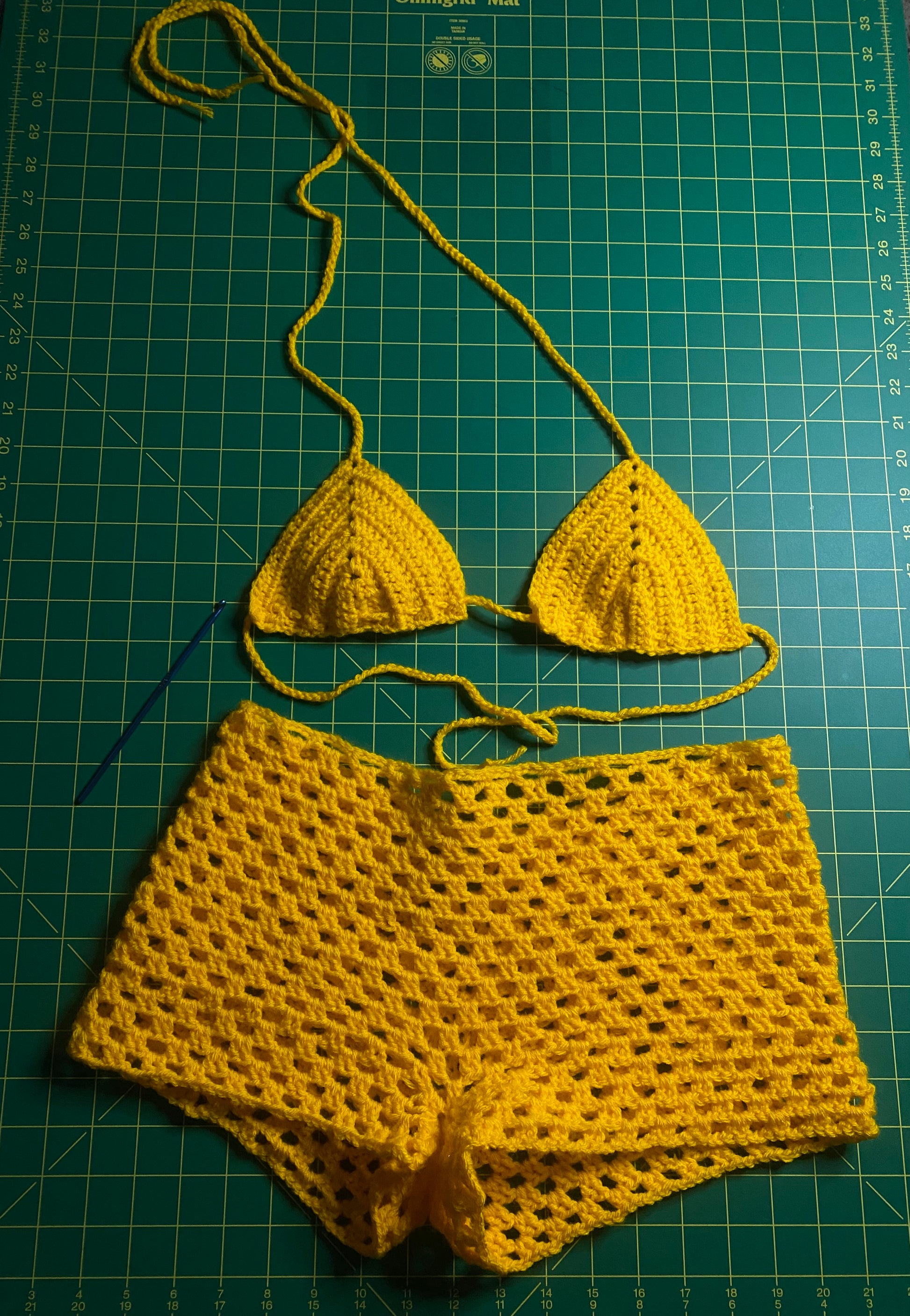 Milan set consist of crochet shorts with bikini top. The bikini top comes with long straps to style how you like.